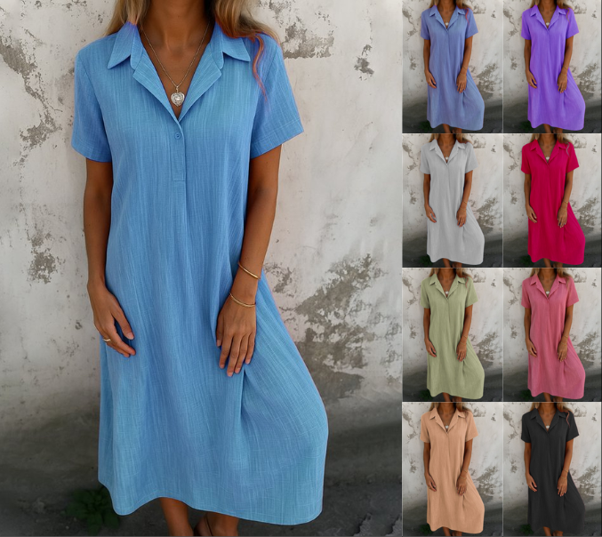 Women Plain Short Sleeve Summer Dress Shirt Collar Daily Casual Maxi A-Line Dress(Buy 2 Free Shipping)